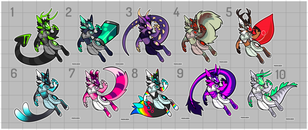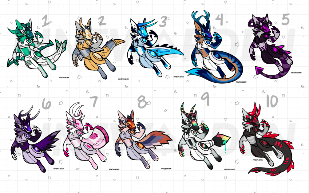 This protogen base contains a frickton of tails, some nice horns, rendered visor parts, some fluff options, wing options...! There's quite a lot in this base because I use it often for adoptables (hence the name).